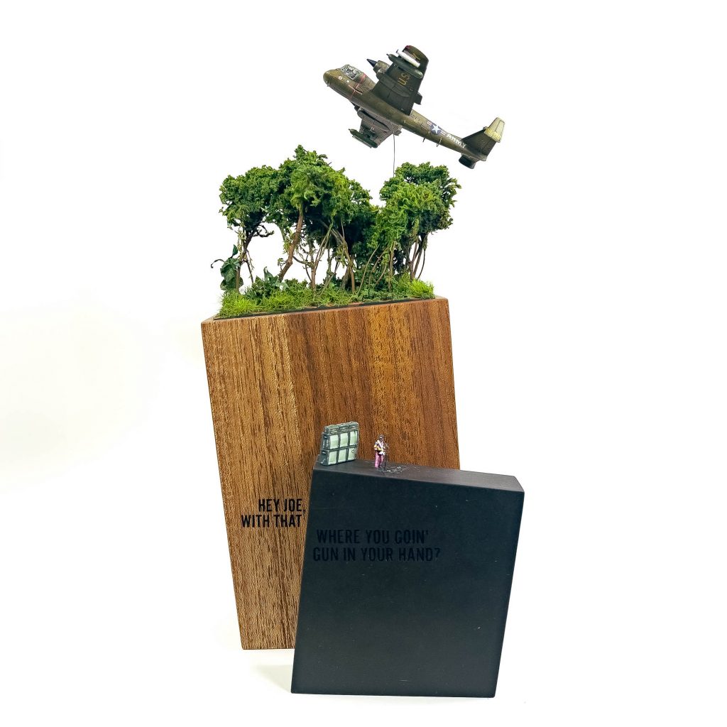 The early days of the Vietnam War: Low over the dense jungle canopy, a U.S. Army OV-1 Mohawk slices through the humid air, its twin turboprops scattering a flock of startled parakeets. Below, concealed movement; above, relentless reconnaissance. Nearby, Jimi Hendrix unleashes a blistering solo, his wall of Marshall amps shaking the scene with raw electric force – 1/144 Vignette