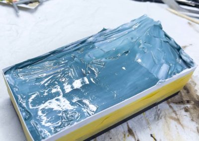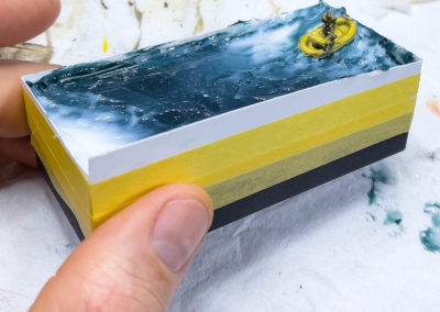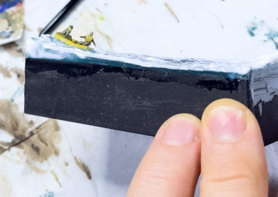Then I applied a second, also coarse layer. Here I tried to model the final wave movement. This layer was also coloured with one or two drops of paint. After 24 hours this layer was dry. After correcting the edges with a hobby knife, I applied the last layer thinly and evenly. This time without paint. With the back of a pencil I pressed in the structure. After drying, I applied a layer of gloss varnish to even out small imperfections. Now I painted the whitecaps of the waves with paint and a fine brush.